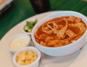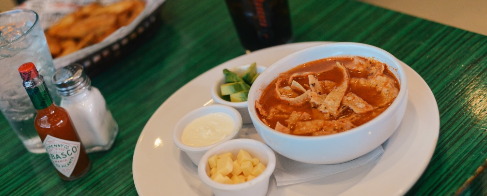 Deliciosa sopa de tortilla estilo Tex Mex, caldo de pollo sazonado acompañado de tiritas de tortilla, aguacate y queso gratinado.