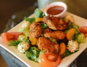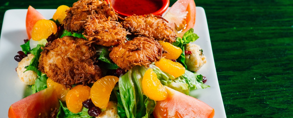 Camarones al coco rebozados y fritos, lechuga romana, mandarina, arándanos, queso crema con cacahuate tostado, una poderosa combinación que ¡No puedes dejar de probar!