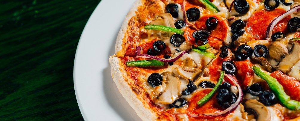 Excelente combinación de pepperoni, champiñones, cebolla morada, pimiento verde, aceitunas negras, queso mozzarella y salsa marinara.