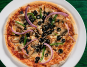 Pimiento verde, cebolla, champiñones, aceitunas negras, queso mozzarella y salsa marinara.