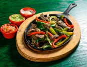 Jugosas fajitas sazonadas al estilo Comicx con pimientos verdes y rojos, cebolla asada, servidas en un sartén caliente acompañadas de salsa pico de gallo, guacamole y crema.