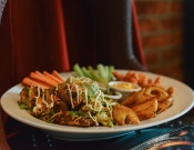 Deliciosos buffalo boneless, onion rings, chili beans nachos y crujientes fantastic fries, acompañado con aderezos, zanahoria y apio.