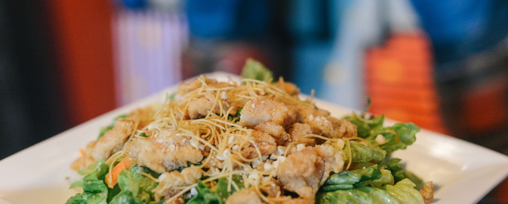 La fresca combinación de lechuga, cacahuate y tallarines, Acompañados de crujientes tiras de pollo empanizadas. ¡Bañada con nuestro aderezo oriental de la casa!