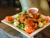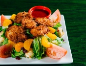 Camarones al coco rebozados y fritos, lechuga romana, mandarina, arándanos, queso crema con cacahuate tostado, una poderosa combinación que ¡No puedes dejar de probar!