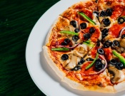 Excelente combinación de pepperoni, champiñones, cebolla morada, pimiento verde, aceitunas negras, queso mozzarella y salsa marinara.
