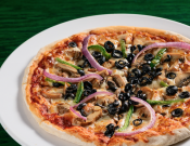 Pimiento verde, cebolla, champiñones, aceitunas negras, queso mozzarella y salsa marinara.